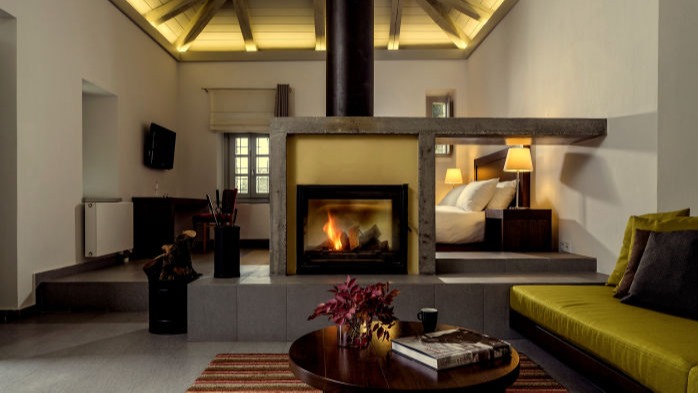 The resort is arranged across three traditional stone buildings and seven independent studio villas, set on one of the hills overlooking the village. Two buildings host seven guest rooms, while the third houses the breakfast area, Diava Restaurant, and spaces for retreats, conferences, and small gatherings.